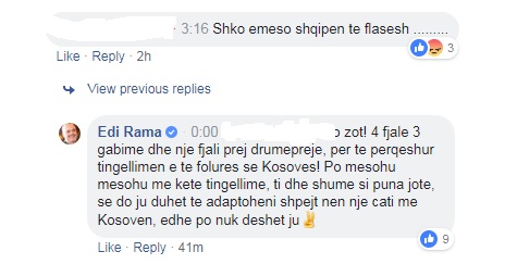 Një qytetar shkruan se ministri duhet të mësojë të flasë shqip, ndërsa Rama i kundërpërgjigjet duke i thenë se vetë komentuesi 3 në 4 fjalë i ka shkruar gabim.