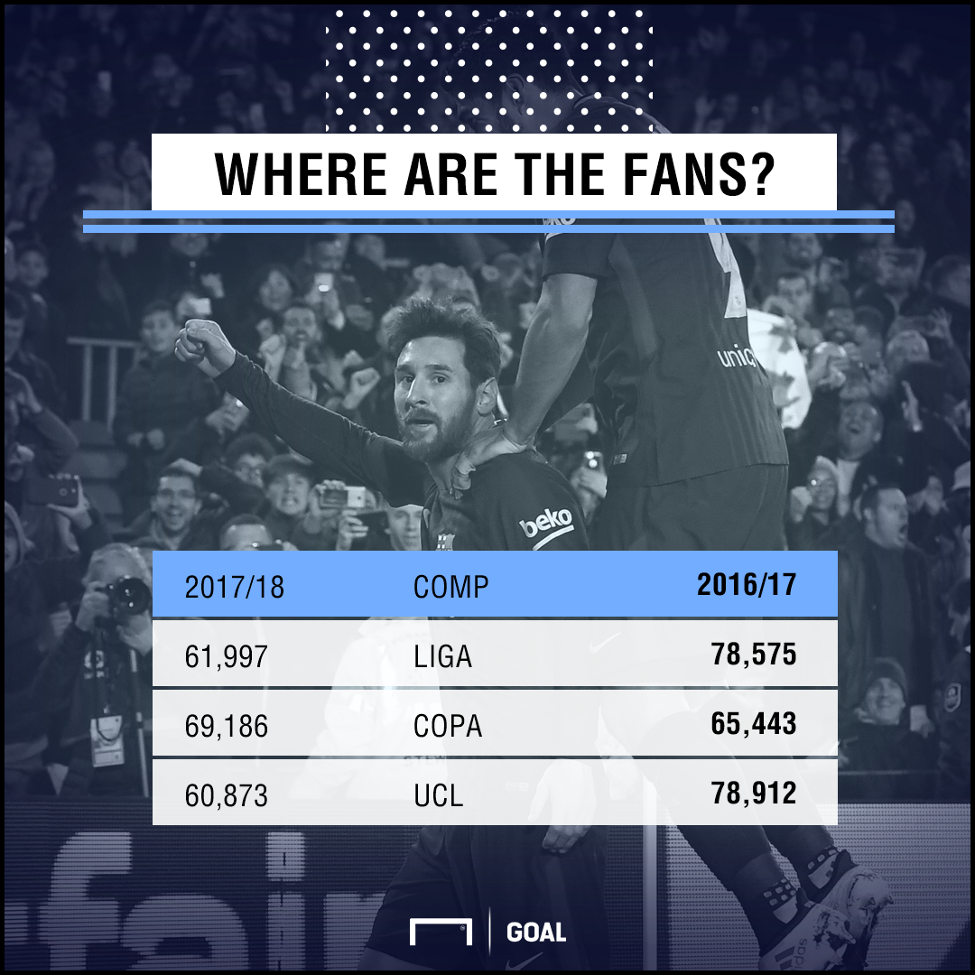 Në edicionin 2016/17 mesatarja e tifozëve në Camp Nou ishte 78.575 tifozët për ndeshje, ndërsa këtë sezon është 61.997. Më mirë është në Copa del Rey, ku nga 65.443 mijë tifozë një vit më parë, këtë sezon është rritur në 69.186 mijë. Rënie ka edhe në Ligën e Kampionëve, ku nga 78.912 mijë, ka rënë në 60.873. Mirëpo, ky interesim pritet të rritet në pjesën tjetër të sezonit, kur do të zhvillohen edhe ndeshjet vendimtare në La Liga, Copa del Rey dhe Ligën e Kampionëve, përgatiti”Express”. (b.an)