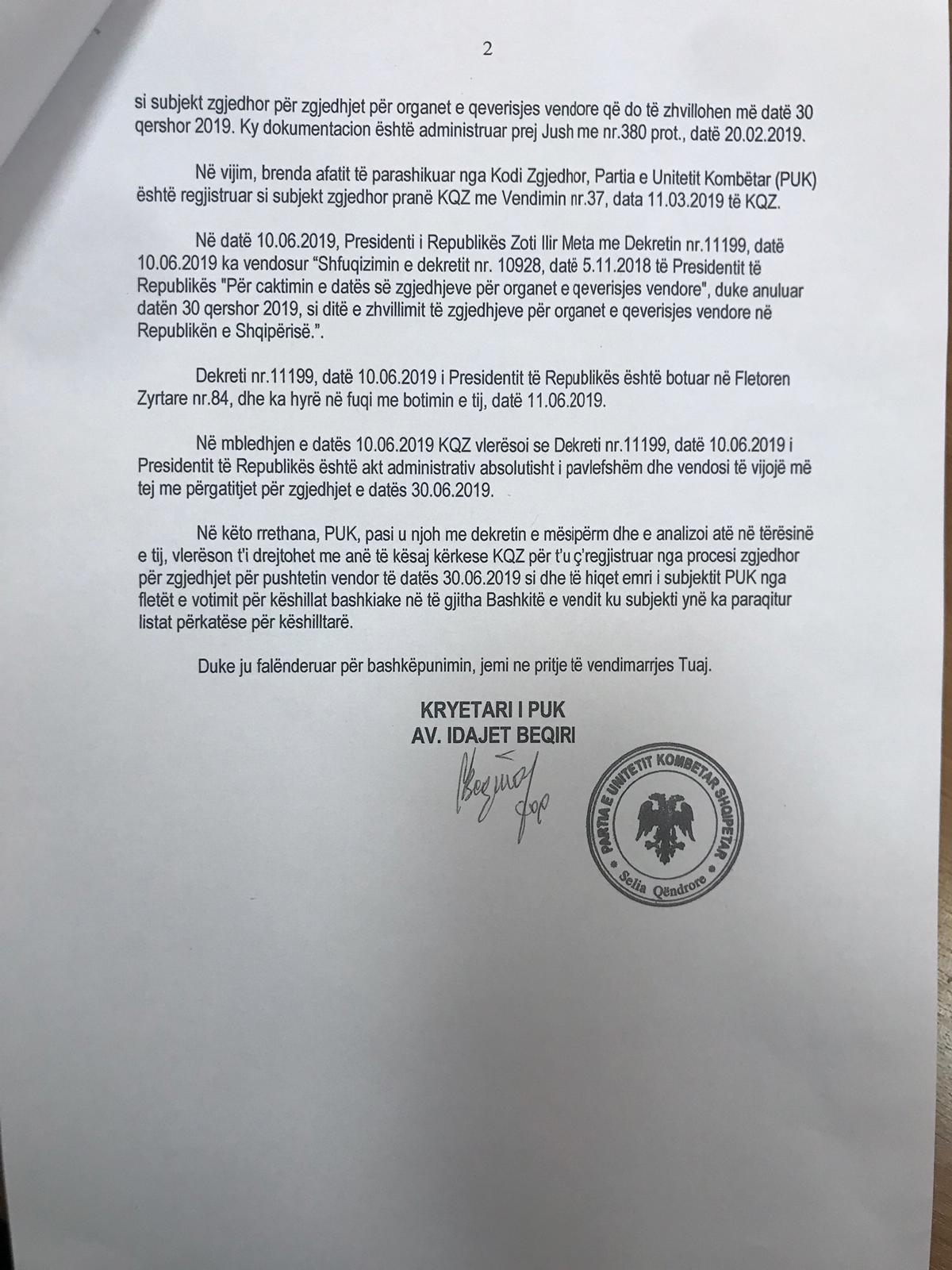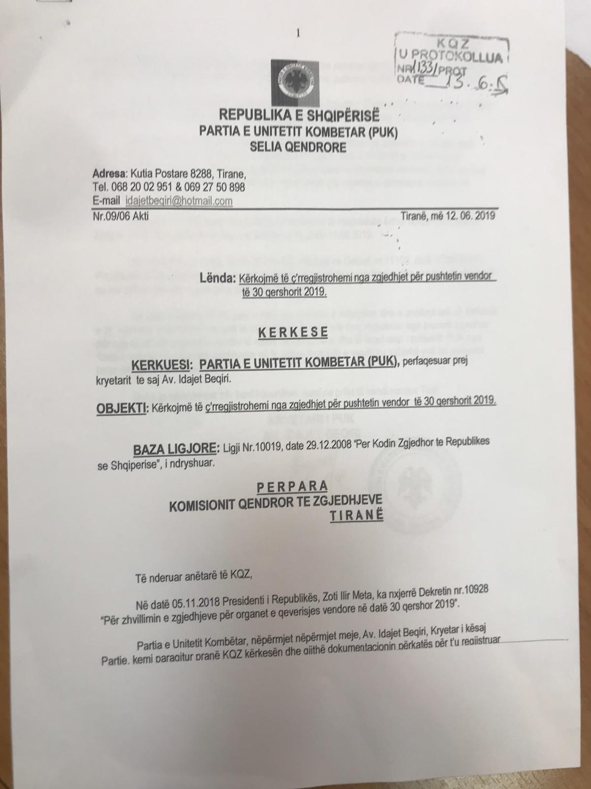 Kërkesa e dorëzuar sot në KQZ, mban firmën e drejtuesit të kësaj partie, avokatit Idajet Beqiri, ndërsa vendimi pason dekretin e presidentit Ilir Meta për anulimin e datës së zgjedhjeve.