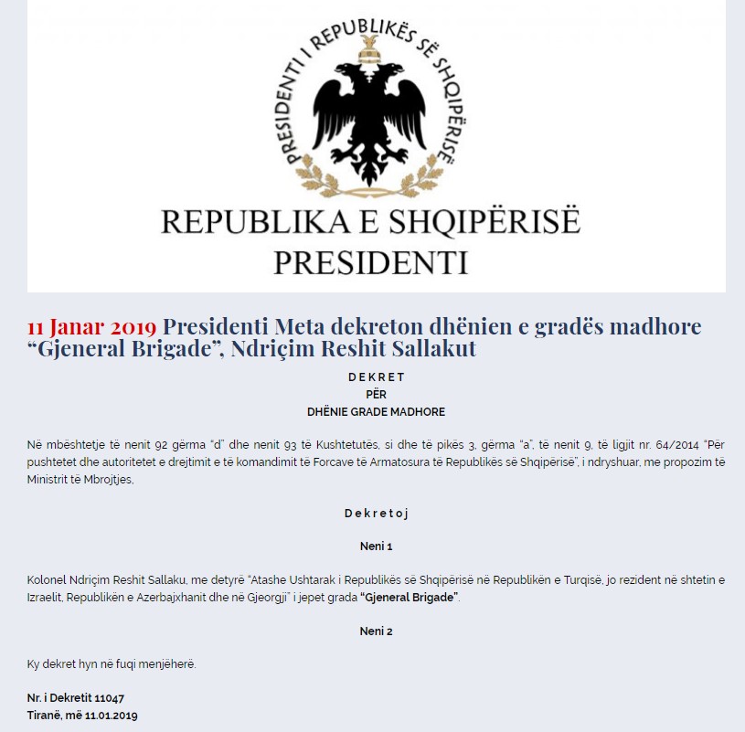 Në dekretin e Presidentit thuhet se “Kolonel Ndriçim Reshit Sallaku, me detyrë “Atashe Ushtarak i Republikës së Shqipërisë në Republikën e Turqisë, jo rezident në shtetin e Izraelit, Republikën e Azerbajxhanit dhe në Gjeorgji” i jepet grada “Gjeneral Brigade”.