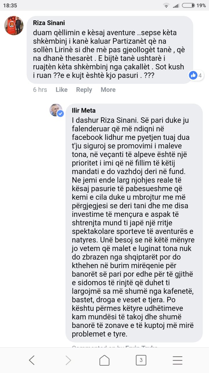 “I dashur Riza Sinani. Së pari duke ju falenderuar që më ndiqni në facebook lidhur me pyetjen tuaj dua t’ju siguroj se promovimi i maleve tona, në veçanti të alpeve është një prioritet i imi që në fillim të këtij mandati e do vazhdoj deri në fund. Ne jemi ende larg njohjes reale të kësaj pasurie të pabesueshme që kemi e cila duke u mbrojtur me më përgjegjesi se deri tani dhe me disa investime të mençura e aspak të shtrenjta mund ti japë një rritje spektakolare sporteve të aventurës e natyres. Unë besoj se në këtë mënyre jo vetem që malet e luginat tona nuk do zbrazen nga shqiptarët por do kthehen në burim mirëqenie për banorët së pari por edhe për të gjithë e sidomos të rinjtë që duhet ti largojmë sa më shumë nga kafenetë, bastet, droga e veset e tjera. Po kështu përmes këtyre udhëtimeve kam mundësi të takoj dhe shumë banorë të zonave e të kuptoj më mirë problemet e tyre“, shkruan Meta.