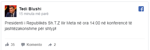 “Presidenti i Republikës Sh.T.Z Ilir Meta në ora 14:00 në konferencë të jashtëzakonshme për shtyp!”, thekson zëdhënësi i Presidentit.