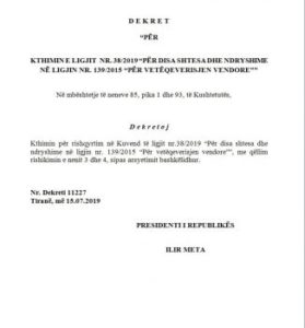 Nisur nga këto qëllime shumë positive Presidenti i Republikës, shpreh dakordësinë e tij për realizimin e shtesave në ligjin ekzistues nr. 139/2015, që bëhen të mundura nëpërmjet dispozitave të nenit 1 të ligjit nr. 38/2019 “Për disa shtesa dhe ndryshime në ligjin nr. 139/2015 “Për vetëqeverisjen vendore””.