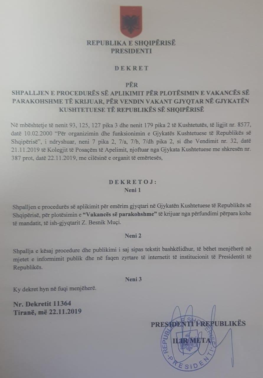 Presidenti Ilir Meta njofton se ka shpallur procedurën e aplikimit për plotësimin e vakancës së parakohshme të krijuar për vendin vakant gjyqtar në Gjykatën Kushtetuese, pas shkarkimit nga KPA të gjyqtarit Besnik Muçi, që Meta e kishte dekretuar pa kaluar vetingun.