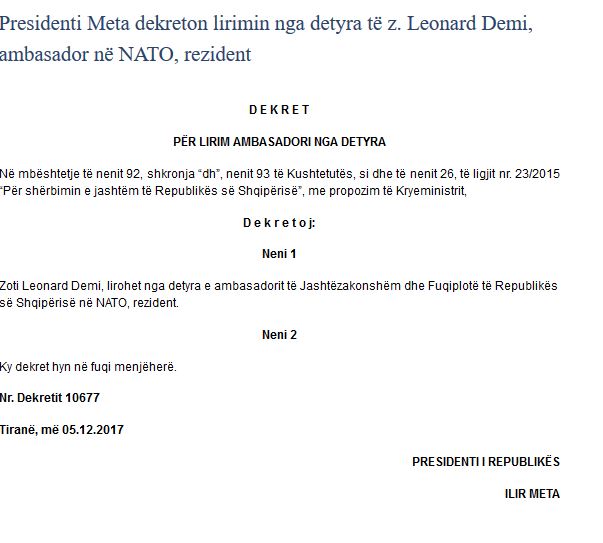 Shqiperia eshte pa ambasador ne NATO. Presidenti Ilir Meta, edhe në rastin e ambasadorit të Shqipërisë në NATO, duket se po ndjek të njëjtën skemë si me kreun e SHISH. Vetëm pak minuta më parë Presidenti ka dekretuar largimin nga detyra te ambasadorit të Shqipërisë në NATO, Leonard Demi, por duke mos dekretuar propozimin e kryeministrit Rama që në vend të Demit të emërohet në këtë post ish kreu i SHISH Visho Ajazi Lika. Ne kete menyre tashme Shqiperia eshte pa ambasador ne NATO. Ndonese e kishte dekoruar edhe me medaljen e “Arte te Shqiponjes”, duket se kjo nuk ka mjaftuar qe Meta ta dekretoje Visho Ajazin ambasador ne NATO, duke krijuar nje grope ne perfaqesimin e Shqiperise ne kete organizem shume te rendesishem. Të nëjtën strategji Meta ndoqi edhe në rastin e kreut të SHISH duke dekretuar largimin e Visho Ajazit, por duke mos dekretuar propozimin e kryeministrit që në vend të tij të jetë Helidon Bendo.