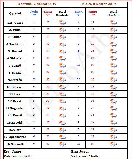 Në fotot e mëposhtme tregohet parashikimi i motit në qytetet kryesore të vendit dhe jo vetëm.