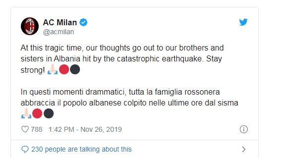 Për këtë moment të vështirë të shqiptarëve, ka reaguar edhe një klub i madh siç është Milani. Këta nëpërmjet një postimi në rrjetet sociale, kanë dalë në mbështetje të shqiptarëve, duke thënë se duhet të qëndrojmë të fortë në këtë moment shumë të vështirë.