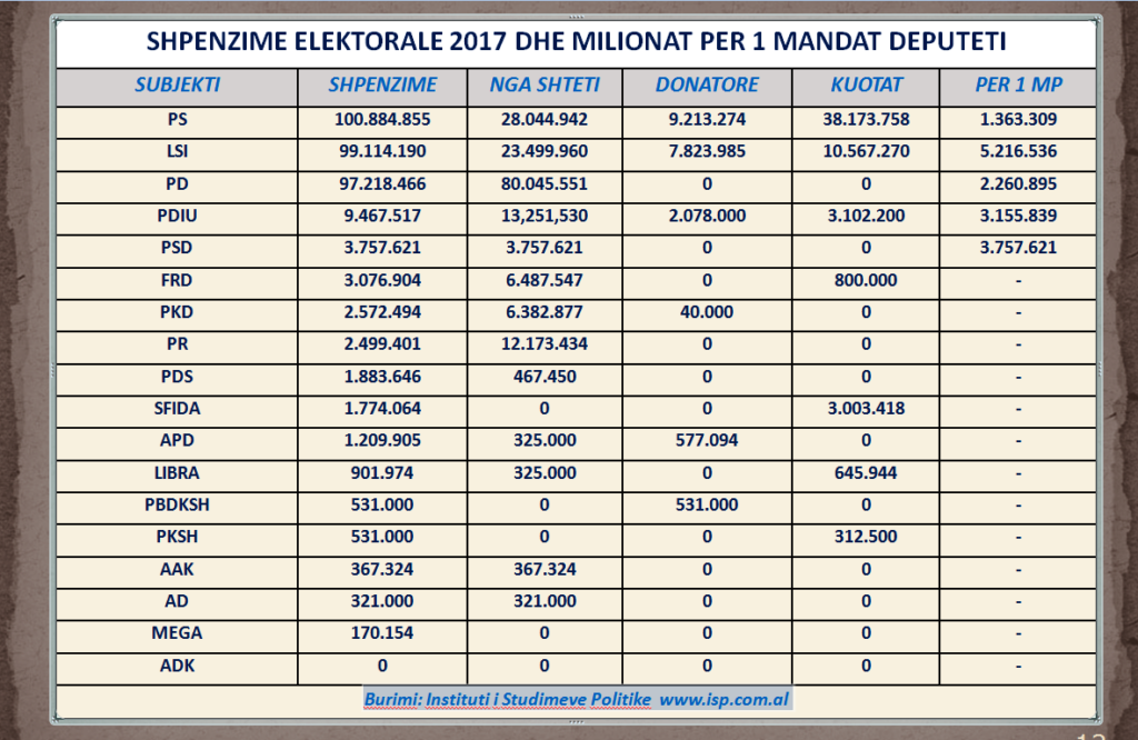 Gjatë 45 ditëve të vitit 2017 të dhënat e Institutit të Studimeve Politike (www.isp.com.al) marrë nga deklarimet e vetë partive (të cilat janë relativisht vetëm 30% e shifrave reale të shpenzimeve) dëshmojnë se Shqipëria harxhoi 3.262.815.150 lekë për të zgjedhur 140 deputetë, nga të cilët, 87% ishin zgjedhur sapo u shpallën listat, dhe fushata de facto bëhej për 13% të emrave në limitet e shanseve për fitore të listave proporcionale. Referuar të dhënave të vetë partive shpenzimet kryesore u bazuan në buxhetin shtetëror, dhe vetëm një përqindje mjaft e vogël në donacione apo mbledhje të kuotave të anëtarëve. Madje, ka parti politike si PD që deklarojnë 0 kuota anëtarësh, diçka absurde dhe natyrisht jo reale, sic partia kryesore në pushtet, PS deklaron vetëm 9 milionë donacione elektorale kur de facto shifra të tilla kanë qenë vetëm në një zonë elektorale nga 140 zonat në nivel vendi. Edhe PSD, partia e biznesmenit që mori një mandat në Shkodër deklaron 0 sponsorizime, diçka natyrisht pa lidhje me realitetin.