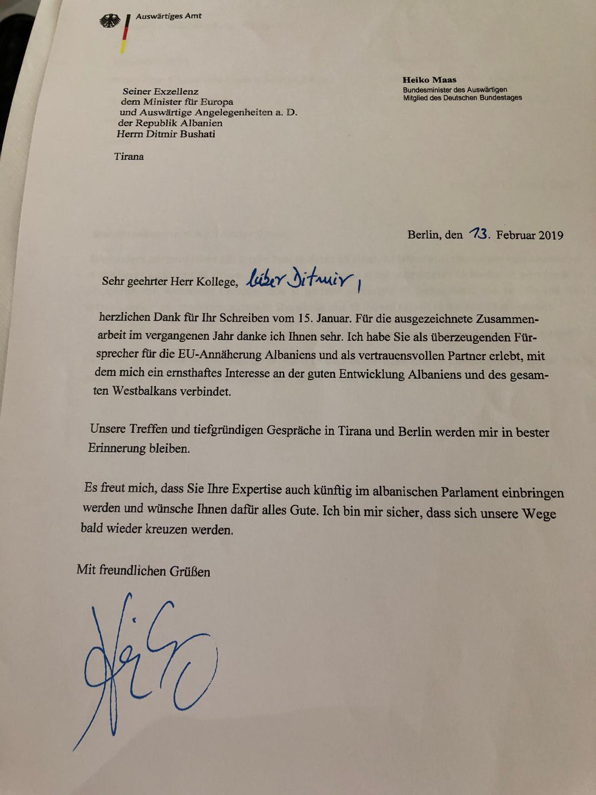 Kënaqësi të merrja sot letrën e kolegut e mikut të shumë vlerësuar, ministrit të jashtëm gjerman Heiko Maas, që konfirmon këtë rol të pazëvendësueshëm të partnerit tonë por dhe besim të palëkundur te rrugëtimi ynë europian”.