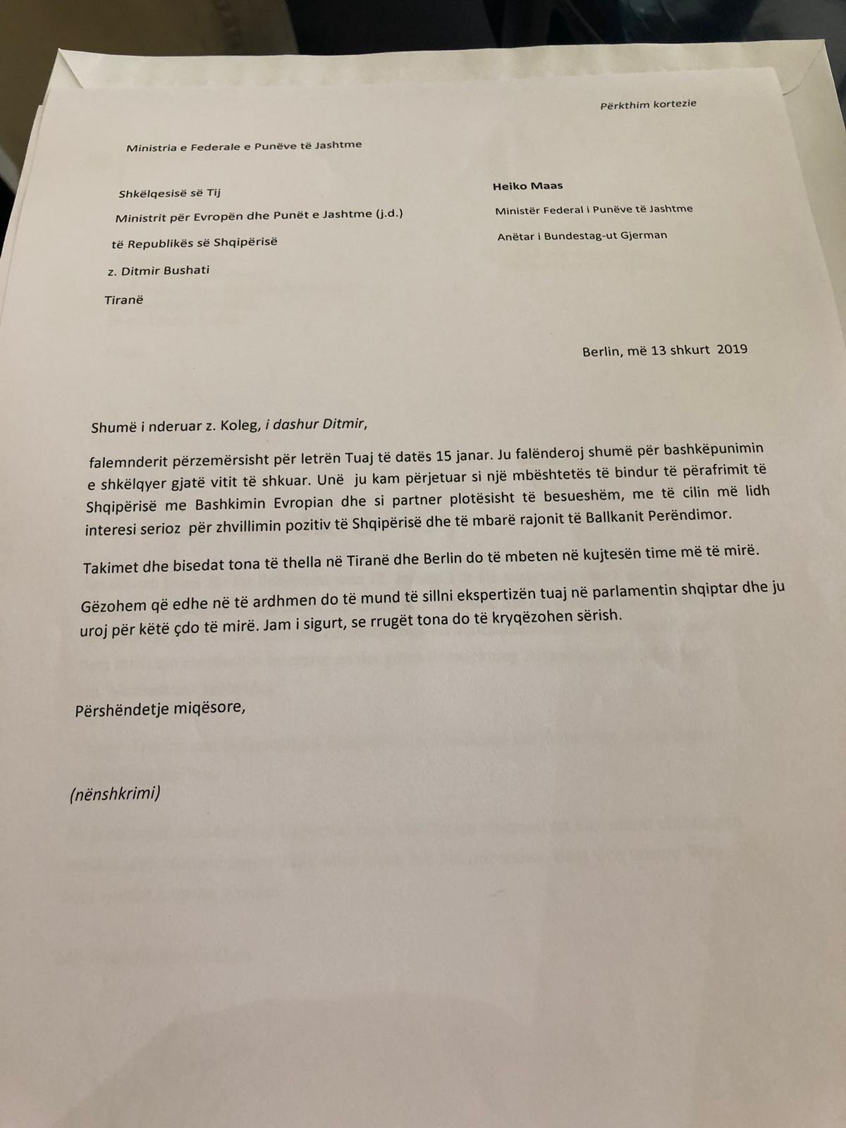 Bushati komenton letrën e ministrit gjerman teksa shkruan: