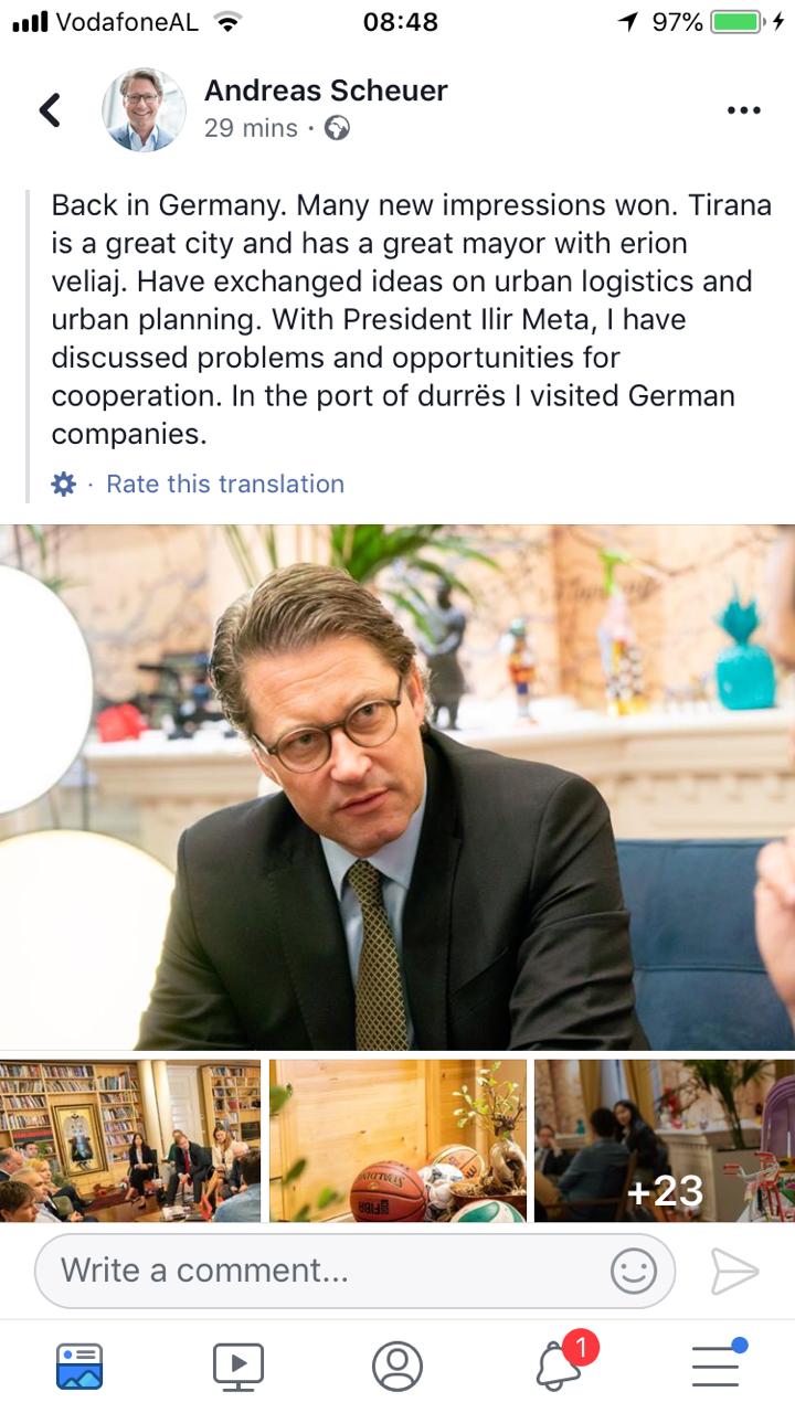 Duket se vizita në Tiranë ka lënë mbresa të jashtëzakonshme për Ministrin Scheuer. Ai ka publikuar në profilin e tij edhe disa momente mjaft interesante nga takimi me kryebashkiakun Veliaj.