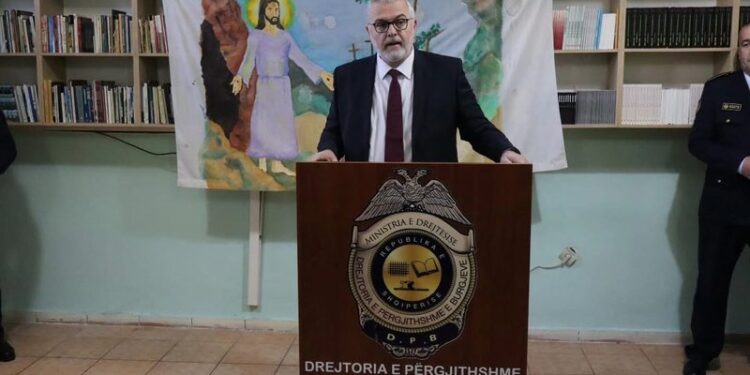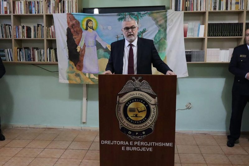 Ministri i Drejtësisë Toni Gogu dhe Drejtori i Përgjithshëm i Burgjeve Adriatik Kupi, bashkë me zyrtarë të tjerë, morën pjesë sot në meshën e Pashkës në një nga Institucionet e Ekzekutimit të Vendimeve Penale (IEVP), ku përcolli një mesazh për të paraburgosurit që festojnë këtë ditë të shenjtë.