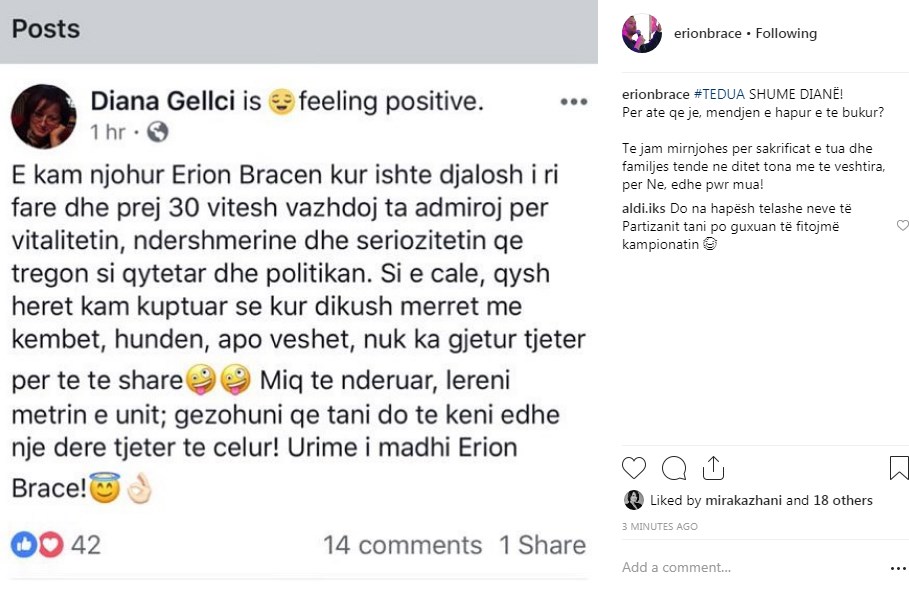 Për të gjithë ata që kanë bërë meme humoristike apo kanë sharë në rrjet Erion Braçen e zgjedhur së fundmi nga kryeministri për të qenë numri dy i qeverisë, përgjigjen e kanë marrë nga një shoqja e tij, Diana, e cila e njeh prej shumë vitesh Erionin dhe ka shkruar ca fjalë për të në rrjet.