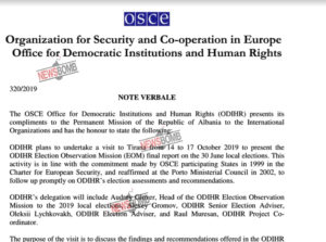Misioni OSBE/ODIHR do të vijë javën tjetër në Shqipëri. Burime bëjnë me dije se misioni OSBE/ODIHR do të qëndrojë në Tiranë nga data 14 deri në 17 tetor.