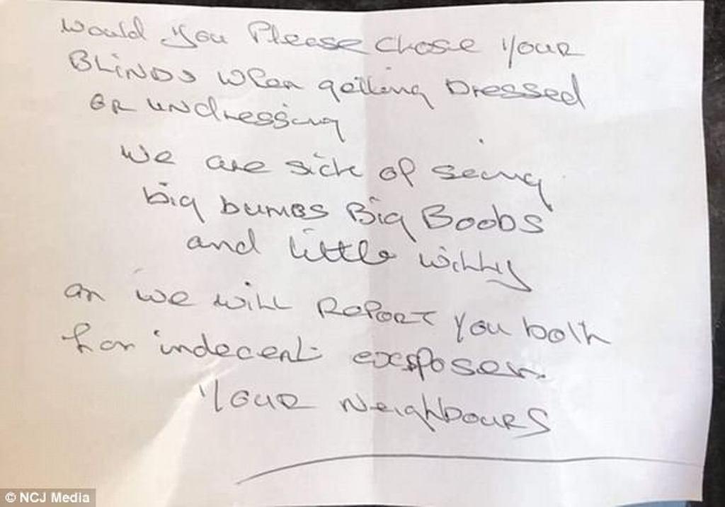 “U mërzitëm duke parë gjokset e mëdha të ekspozuara”, shkruhej në letër. Fqinji paralajmëronte se do të denonconte çiftin në polici për “shfaqje të pahijshme”./a.m.