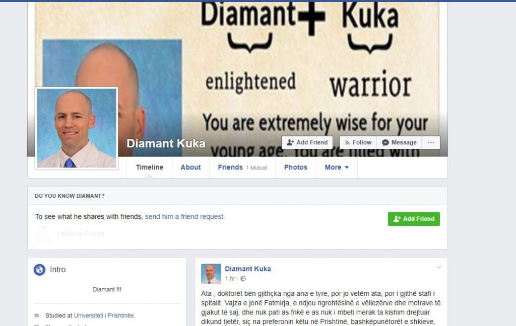 Por pa asnjë verifikim minimal, denoncimi i personit pas profilit fals në Facebook që shtiret si “MJEKU DIAMANT KUKA”, u mor si i vërtetë dhe pushtoi faqet e mediave elektronike, dhe jo vetëm.