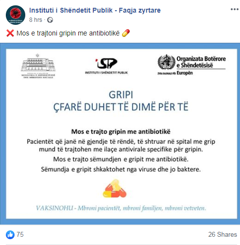 “Mos e trajto sëmundjen e gripit me antibiotikë. Sëmundja e gripit shkaktohet nga viruse dhe jo nga bakterie”, kanë shkruar ata.