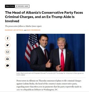“Prokurorët shqiptar,- thuhet aty-, njoftuan se kanë në plan të ngrënë akuza penale kundër Bashës, lidhur me pagesat prej më shume së 600,000 dollarë, që Partia e tij thuhet t’i ketë bërë në 2017-ën një lobisti republikan në Uashington”.