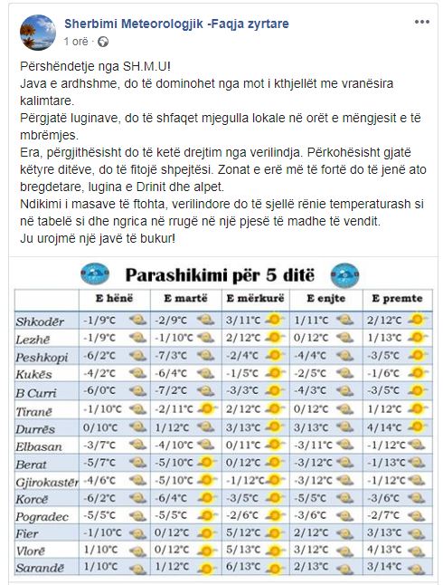 Ndikimi i masave të ftohta, verilindore do të sjellë rënie temperaturash si në tabelë si dhe ngrica në rrugë në një pjesë të madhe të vendit. Ju urojmë një javë të bukur!