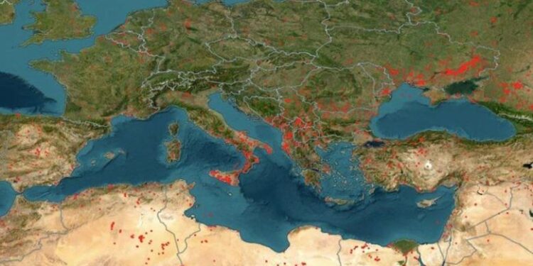 NASA-s ka kapur imazhe të qarta të vatrave të zjarreve që janë përhapur përgjatë gjithë Mesdheut. Nga Greqia në Spanjë, nga jugu i Francës në Qipro, nga Italia në Shqipëri, qindra vatra aktive janë duke djegur pyje dhe zona të mëdha të gjelbërta.