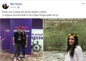 Ndër ta edhe Eljo Hysko, ish kreu i FRESSH, aktualisht deputet i Partisë Socialistë i cili ka publikuar një foto me vajzën e ndarë nga jeta dhe shkruan i prekur: “Ende nuk e besoj dot që kjo është e vërtet! U largove shumë herët e mira Rajs! Paqja qoftë me ty!”.
