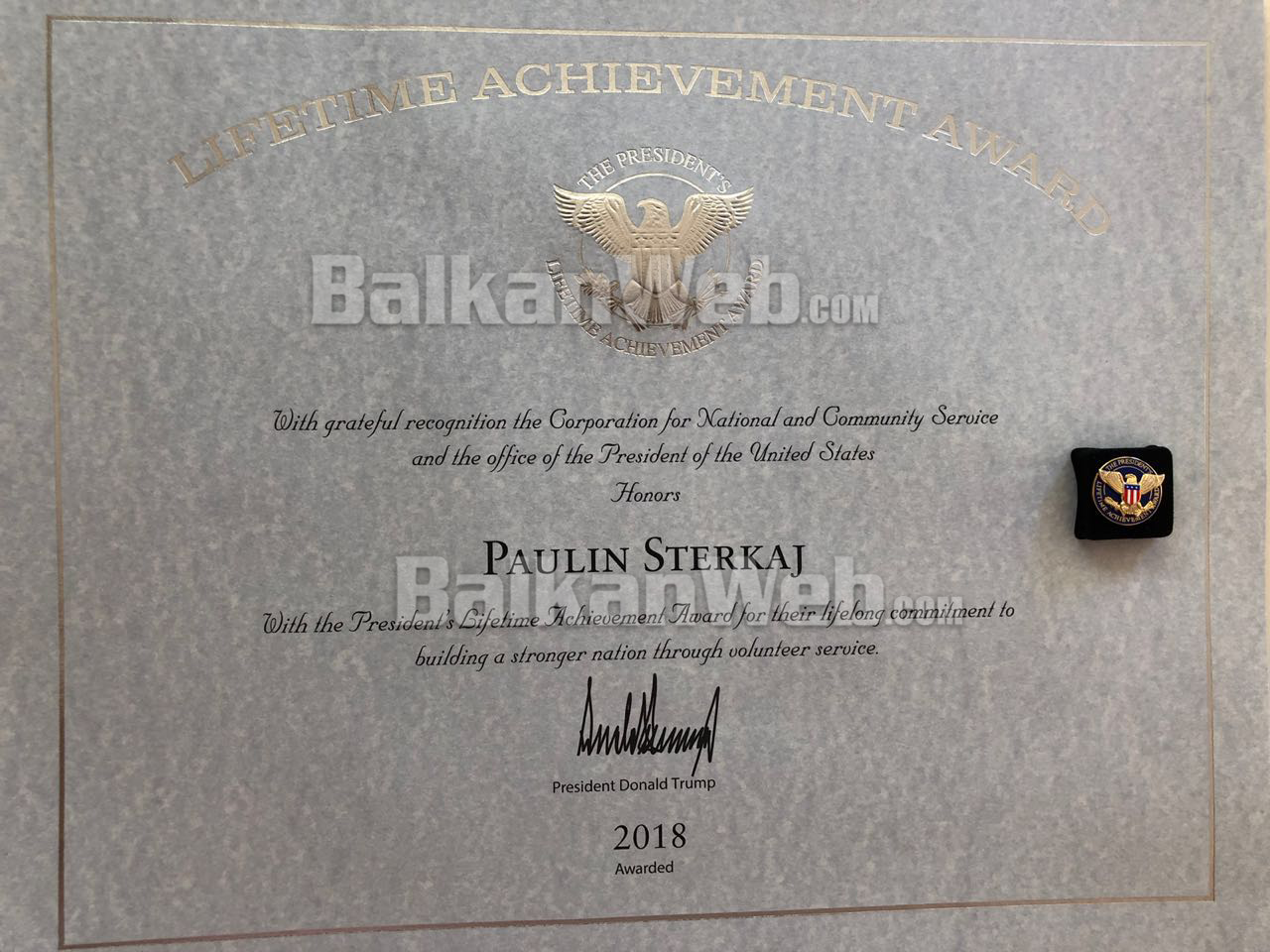 Çmimi në fjalë, me motivacion për arritjet në jetë, u firmos nga presidenti i SHBA-ve Donald Trump, për kontributin e veçantë për personat në nevojë.