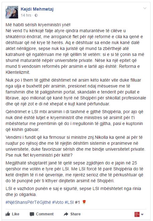 Më dërguan sot një status të Kejdit, ku akuzon për dështime në arsim këto katër vjet. Habitem që kandidatë të LSI sillen si opozitarë. S’ka përligjie më të mirë se ky status, për kërkesën tonë që, PS duhet të drejtojë e vetme timonin e reformave në të katër vitet e ardhshme. Ky status është vërtetimi që, forcat e tjera në koalicion, njërën dorë e mbajnë në timonin e qeverisë dhe tjetrën e përdorin për të goditur forcën kryesore që nxit reformat në vend.