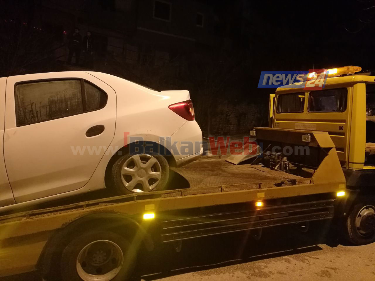 Në dalje të qytetit, makina e grabitësve që shihni edhe në fotot e siguruara për “BalkanWeb” nga gazetari Shkëlzen Henkoja është përplasur me bordurën anësore të rrugës.