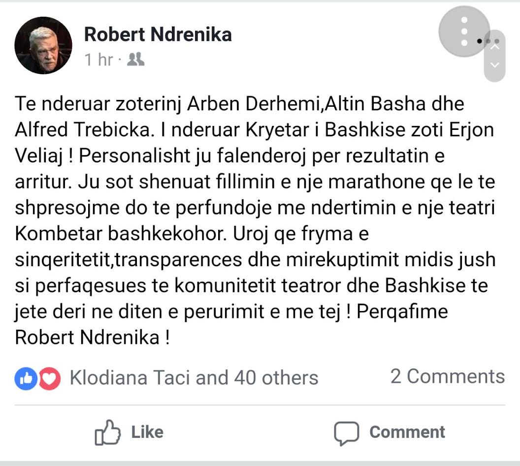 Ikona e skenës teatrore dhe kinematografike shqiptare, Robert Ndrenika ka përshëndetur marreveshjen e arritur në negociatat mes kryetarit të Bashkisë së Tiranës, Erion Veliaj dhe përfaqësisë së komunitetit të artistëve për ndërtimin e një Teatri të ri Kombëtar.