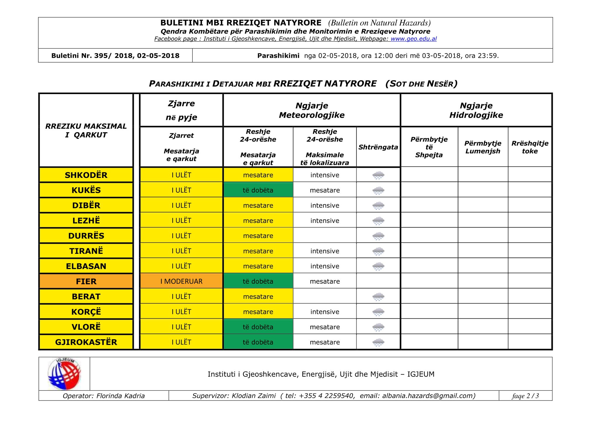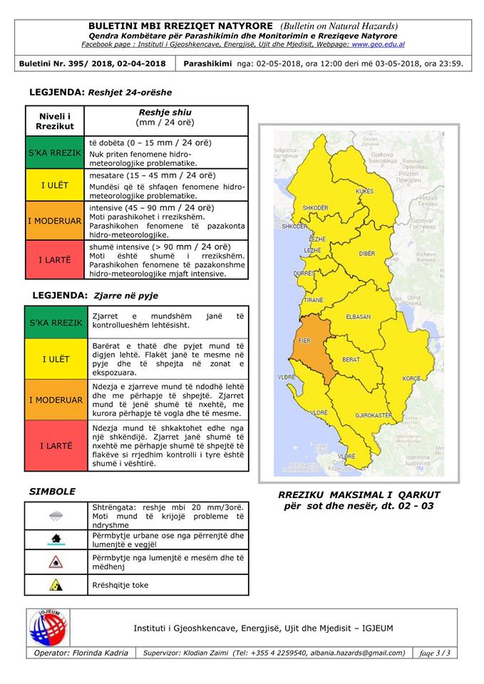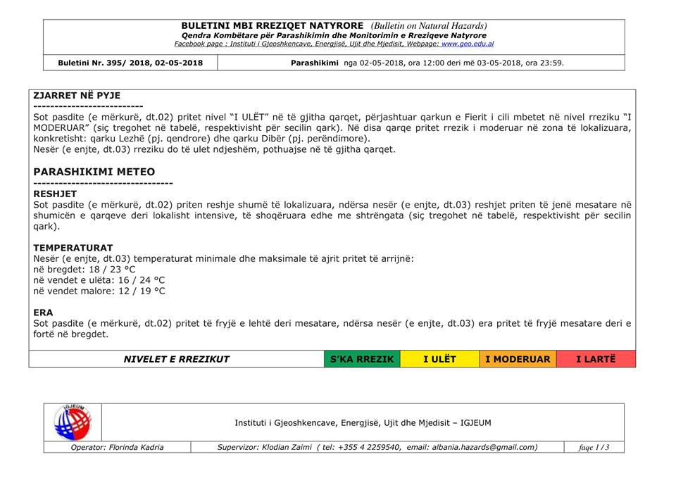 Sipas IGJEUM sot reshjet priten të jenë mesatare në shumicën e qarqeve deri lokalisht intensive, të shoqëruara edhe me shtrëngata (siç tregohet në tabelë, respektivisht për secilin qark).