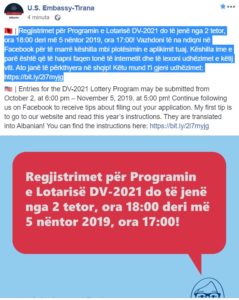 “Regjistrimet për Programin e Lotarisë DV-2021 do të jenë nga 2 tetor, ora 18:00 deri më 5 nëntor 2019, ora 17:00! Vazhdoni të na ndiqni në Facebook për të marrë këshilla mbi plotësimin e aplikimit tuaj. Këshilla ime e parë është që të hapni faqen tonë të internetit dhe të lexoni udhëzimet e këtij viti. Ato janë të përkthyera në shqip! Këtu mund t’i gjeni udhëzimet: https://bit.ly/2l7myjg“, shkruhet në postimin e ambasadës.
