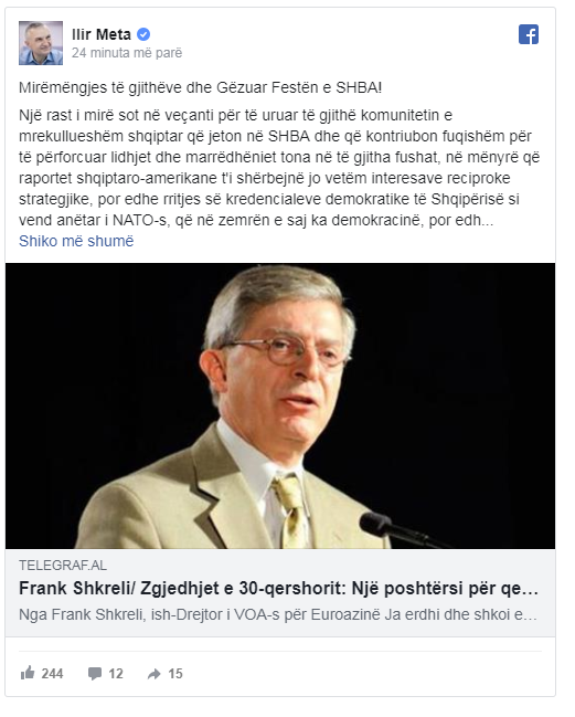 Për të mbështetur këtë argument, Presidenti ka ndarë me miqtë e tij në facebook një artikull të shkruar nga një prej personaliteteve të komunitetit tonë në SHBA, Frank Shkreli, ish-drejtor i Zërit të Amerikës.