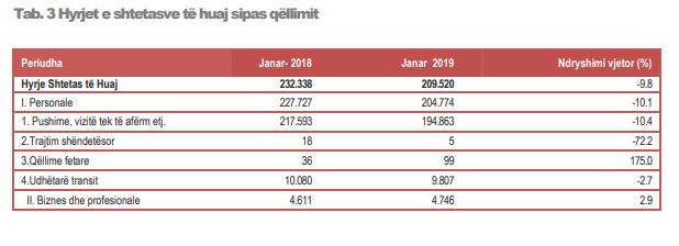 “Në Janar 2019, hyrjet e shtetasve të huaj në vend janë 209.520. Krahasuar me janar 2018, ky numër është ulur me 9,8 %. Në janar 2019, ndër vendet që kanë hyrjet më të larta të shtetasve në Shqipëri, Anglia ka pasur rritjen më të madhe me 7,5%, dhe uljen më të madhe e kanë pasur shtetasit nga Maqedonia me 19,1%