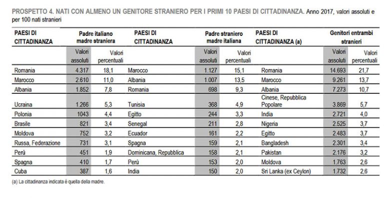 Sipas të dhënave më të fundit të ISTAT-it, nga 458.151 fëmijët e lindur gjatë 2017-ës, 9823 kanë të paktën njërin prind shqiptar. Këto shifra bëhen publike nga raporti më i fundit i publikuar nga Instituti i Statistikave Italiane. Ndërsa në Itali bëhet fjalë për rreth 10 mijë lindje, në total në Shqipëri në të njëjtin vit janë regjistruar mbi 30 mijë lindje.