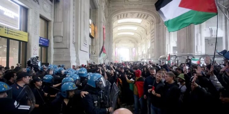 Kaosi shpërtheu në Milano në Stacionin Qendror të qytetit, ku protestuesit me flamuj palestinezë, u përleshën me policinë dhe thyen dritaren e vitrina.