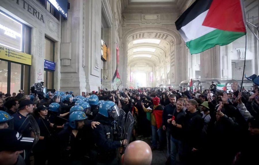 Kaosi shpërtheu në Milano në Stacionin Qendror të qytetit, ku protestuesit me flamuj palestinezë, u përleshën me policinë dhe thyen dritaren e vitrina.