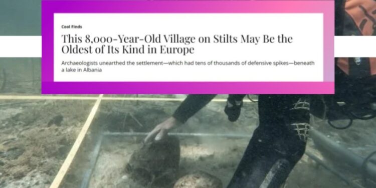 Arkeologët kanë zbuluar mbetjet e një fshati ndoshta 8,000-vjeçar të ndërtuar mbi një liqen të lashtë – fshati më i hershëm i njohur i çdo lloji në Evropë – në liqenin e Ohrit, i cili shtrihet në kufirin e Shqipërisë dhe Maqedonisë së Veriut.