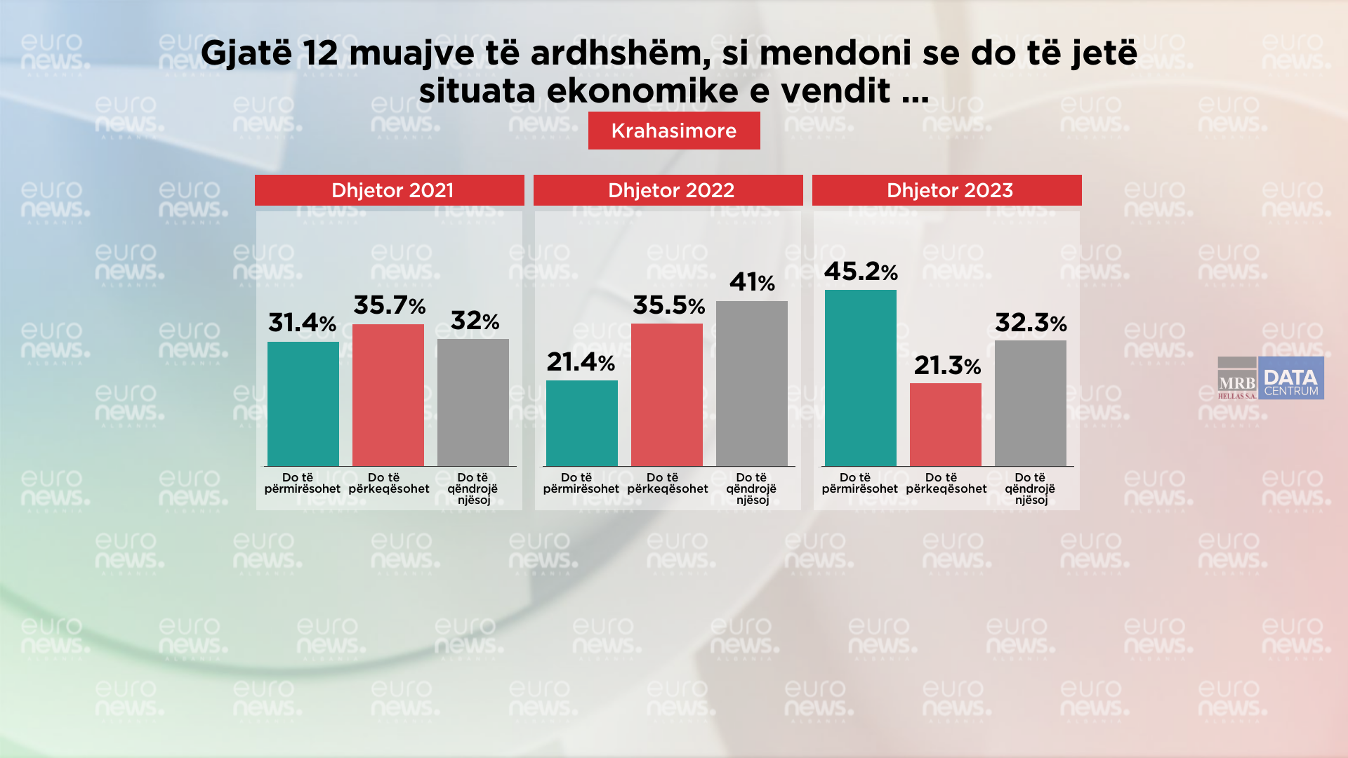 Në 2021, 31 % mendonin se gjendja do të përmirësohej, ishin më pak në 2022 ata që ishin optimistë për gjendjen ekonomike të vendit në 12 muajt e ardhshëm (21%), dhe janë rritur ndjeshëm në matjet e fundit (45%) ata që kanë shpresë se gjendja ekonomike e vendit do të përmirësohet në 13 muajt e fundit.