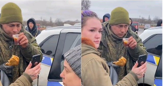 A Russian soldier, after surrendering to the Ukrainians, is given food, hot tea, and allowed to call his mother in Russia so she can see he’s alive.