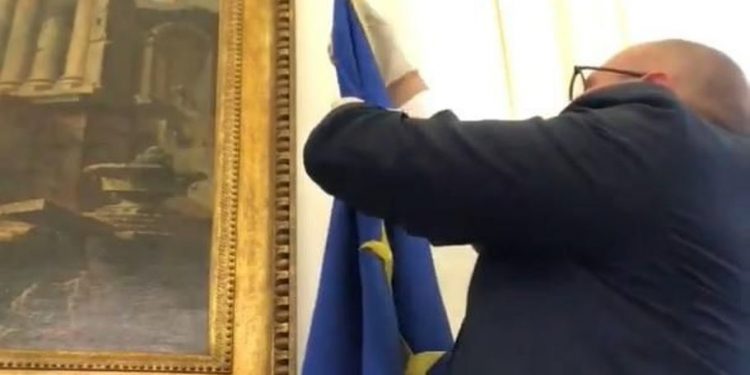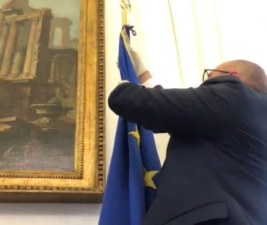 Në një video të publikuar në profilin e tij në Facebook, zëvendës kryetari i Parlamentit italian Fabio Rampelli, filmon veten teksa heq flamurin e BE nga zyra e tij.