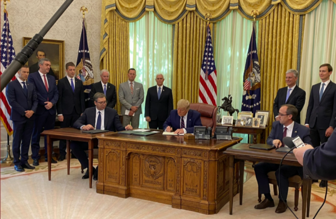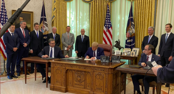 Nënshkruhet marrëveshja mes Kosovës dhe Serbisë në SHBA, ku i pranishëm është edhe Presidenti i SHBA, Donald Trump kurse në krahë të tij Vucic dhe Hoti.