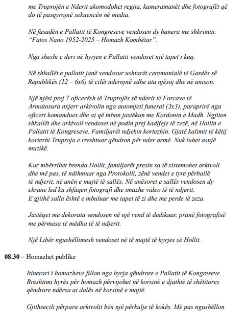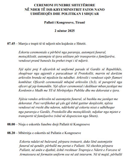 Në përfundim, trupi i Fatos Nanos do të niset nga Pallati i Kongreseve drejt banesës së fundit në Sharrë, ku familja ka kërkuar që ceremonia ortodokse të kryhet në privatësi.