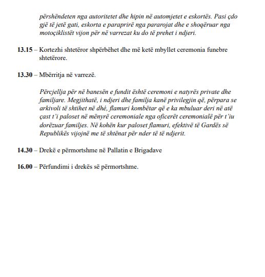 Homazhet publike do të zhvillohen tek Pallati i Kongreseve nga ora 08:30 deri në 11:00, duke u dhënë qytetarëve mundësinë të japin lamtumirën e fundit.