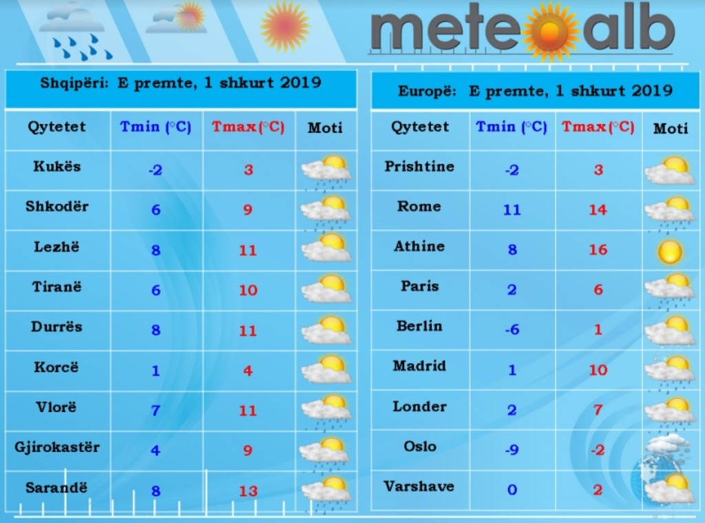Pasditja dhe mbrëmja sjellë përmirësim të kushteve atmosferike, ku kthjellimet dhe vranësirat e lehta do të paraqiten në të gjithë territorin.