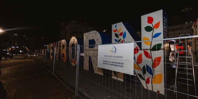 Në rrethim është vendosur edhe tabela me logon e Dhomave të Specializuara, me mbishkrimin: “Kosova e burgosur!”, për të pasqyruar ndjenjën e padrejtësisë që qytetarët dhe Kosova po e përjetojnë përballë proceseve gjyqësore që po zhvillohen në Dhomat e Specializuara të Kosovës në Hagë.