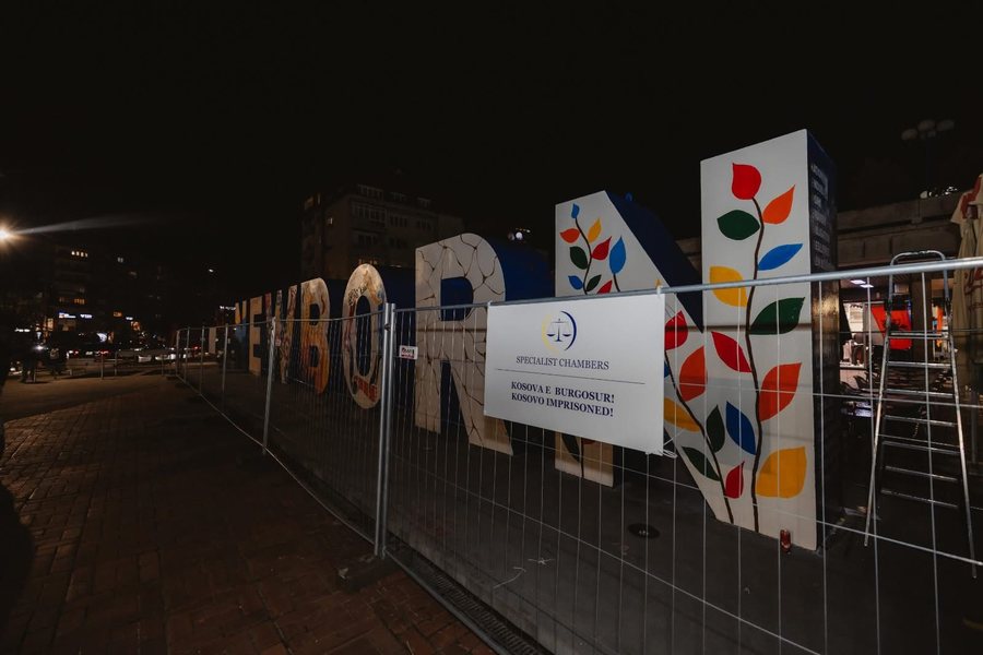 Në rrethim është vendosur edhe tabela me logon e Dhomave të Specializuara, me mbishkrimin: “Kosova e burgosur!”, për të pasqyruar ndjenjën e padrejtësisë që qytetarët dhe Kosova po e përjetojnë përballë proceseve gjyqësore që po zhvillohen në Dhomat e Specializuara të Kosovës në Hagë.