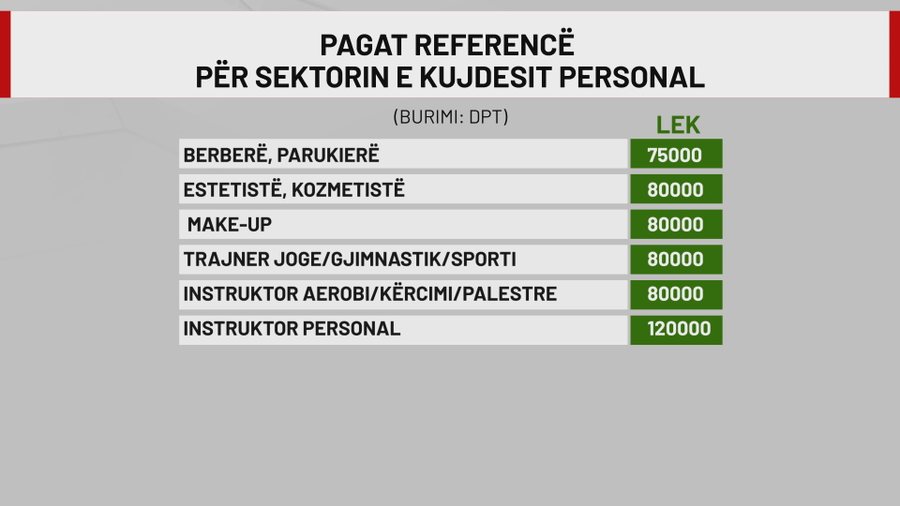 Nga berberët e parukierët te trajnerët e jogës, apo instruktorët personalë në palestra… Drejtoria e Përgjithshme e Tatimeve ka caktuar paga referuese për secilën nga këto kategori profesionesh. Kështu, një berber nuk mund të deklarojë më pak se 75 mijë lekë pagë në muaj. Po aq edhe një parukiere. Për estetistët, kozmetistët dhe “make-up artist” paga referuese është 80 mijë lekë. Po aq për instruktorët në aerobi apo kërcim. Për instruktorët personalë në palestër është caktuar paga 120 mijë lekë në muaj.