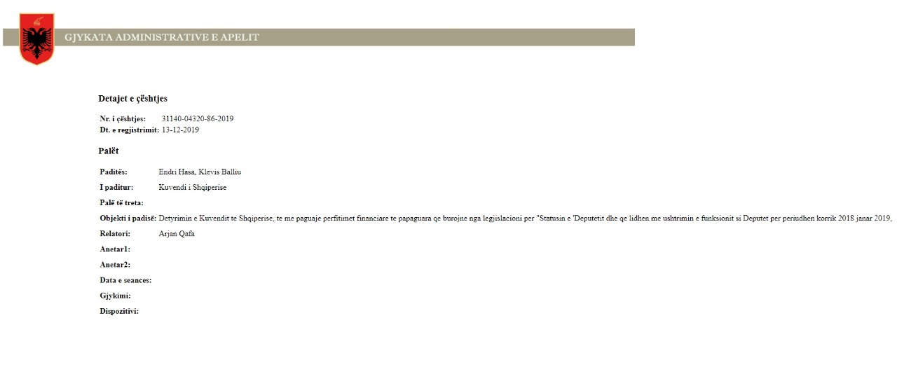 Në kërkesat e siguruara nga tirananews.al, ata kërkojnë: “detyrimin e Kuvendit te Shqiperise, te me paguaje perfitimet financiare te papaguara qe burojne nga legjislacioni per “Statusin e ‘Deputetit dhe qe lidhen me ushtrimin e funksionit si Deputet per periudhen korrik 2018 janar 2019”.