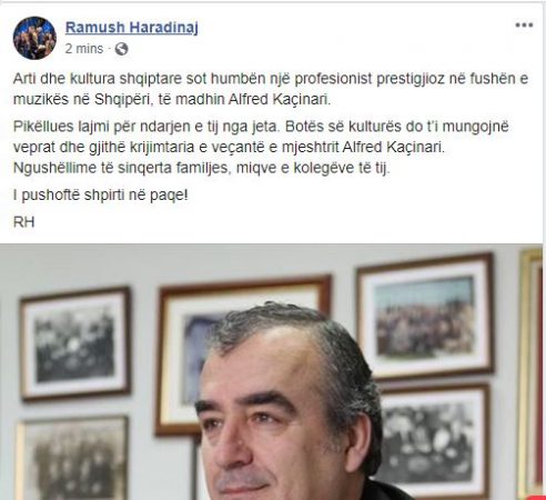 Përmes një statusi në ‘Facebook’, Haradinaj theksonte se sot kultura shqiptare kishte humbur një profesor, ndërsa postonte dhe një foto të Kaçinarit.