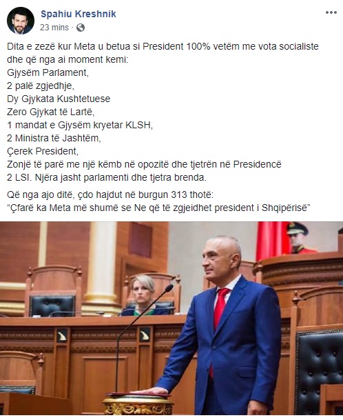 Ish-kreu i Aleancës Kuqezi Kreshnik Spahiu ka reaguar lidhur me ngërçin e krijuar me Gjykatën Kushtetuese. Përmes një postimi në rrjetin social “Facebook”, ai thotë se çdo situatë e tillë ngërçi në institucion, ka ardhur pas zgjedhjes së Ilir Metës si President i vendit.